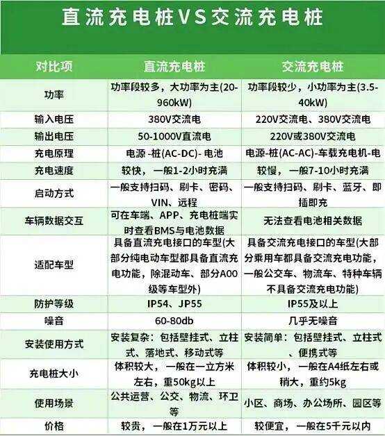 二者核心差异:直流桩直接充电池(无需车载充电器),快充;交流桩需车载充电器,慢充。